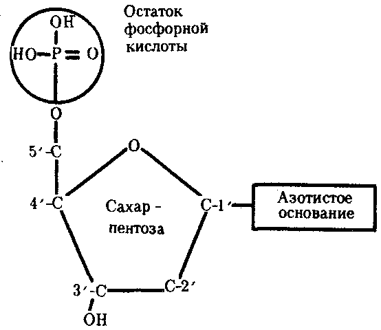 Исследования, направленные на выяснение химической природы наследственного материала, неопровержимо доказали, что материальным субстратом наследственности и изменчивости являются нуклеиновые кислоты, которые были обнаружены Ф. Мишером (1868) в ядрах клеток гноя. Нуклеиновые кислоты являются макромолекулами, т.е. отличаются большой молекулярной массой. Это полимеры, состоящие из мономеров - нуклеотидов, включающих три компонента: сахар (пентозу), фосфат и азотистое основание (пурин или пиримидин). К первому атому углерода в молекуле пентозы С-1' присоединяется азотистое основание (аденин, гуанин, цитозин, тимин или урацил), а к пятому атому углерода С-5' с помощью эфирной связи - фосфат; у третьего атома углерода С-3' всегда имеется гидроксильная группа - ОН (рис.1).