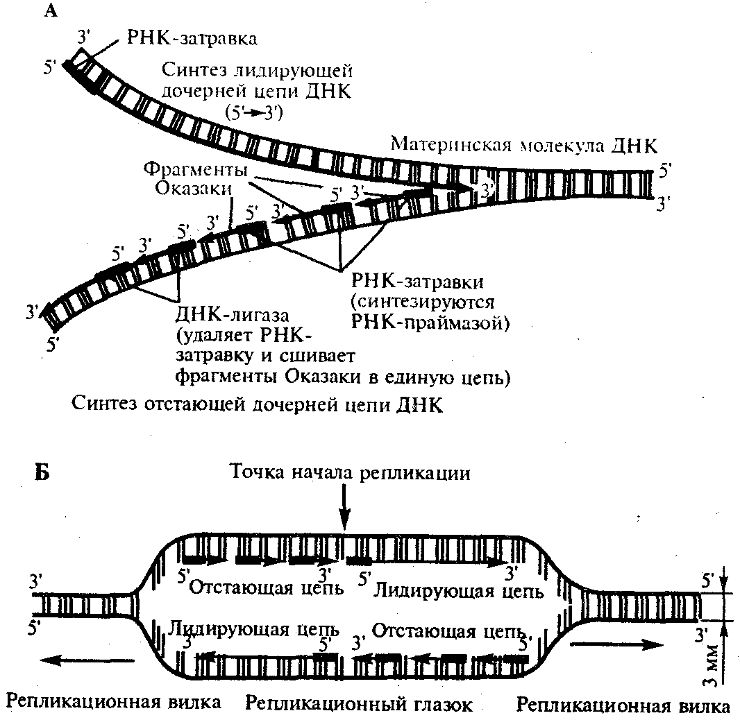 В настоящее время установлено, что синтез второй цепи ДНК осуществляется короткими фрагментами (фрагменты Оказаки) также в направлении от 5' - к 3'-концу (по типу шитья "назад иголкой"). У прокариот фрагменты Оказаки содержат от 1000 до 2000 нуклеотидов, у эукариот они значительно короче (от 100 до 200 нуклеотидов). Синтезу каждого такого фрагмента предшествует образование РНК-затравки длиной около 10 нуклеотидов. Вновь образованный фрагмент с помощью фермента ДНК-лигазы соединяется с предшествующим фрагментом после удаления его РНК-затравки (рис.12, А).