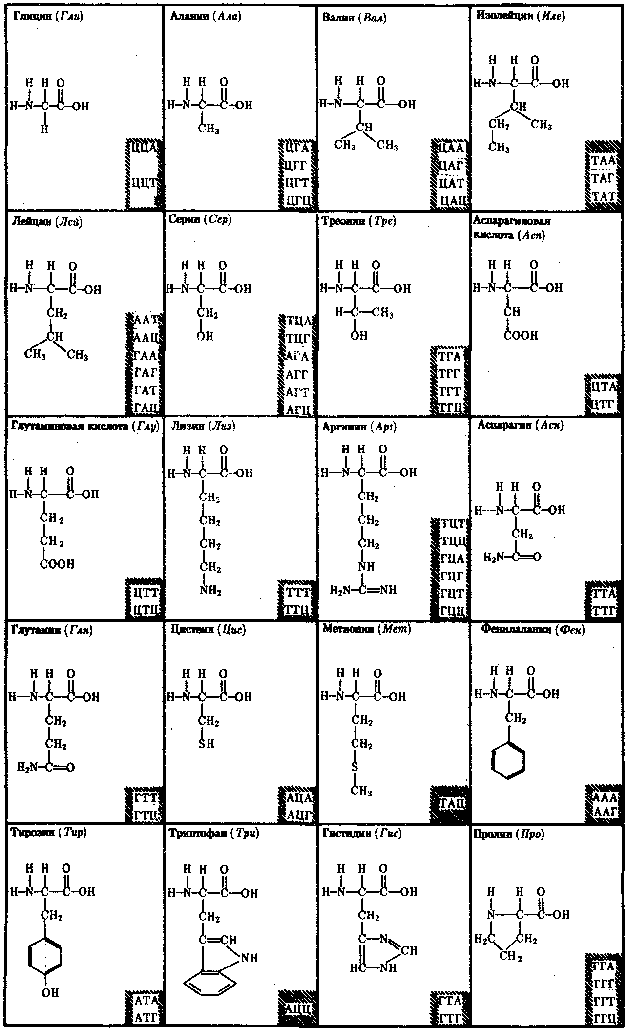 Рис.6. Аминокислоты и кодирующие их триплеты ДНК