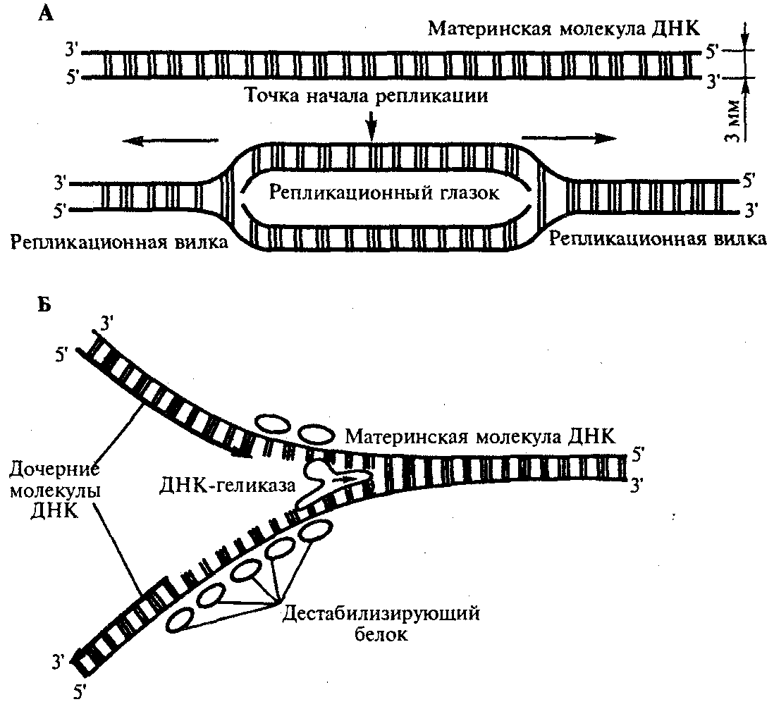 С помощью фермента геликазы, разрывающего водородные связи, двойная спираль ДНК расплетается в точках начала репликации. Образующиеся при этом одинарные цепи ДНК связываются специальными дестабилизирующими белками, которые растягивают остовы цепей, делая их азотистые основания доступными для связывания с комплементарными нуклеотидами, находящимися в нуклеоплазме. На каждой из цепей, образующихся в области репликационной вилки, при участии фермента ДНК-полимеразы осуществляется синтез комплементарных цепей (рис 8, Б).