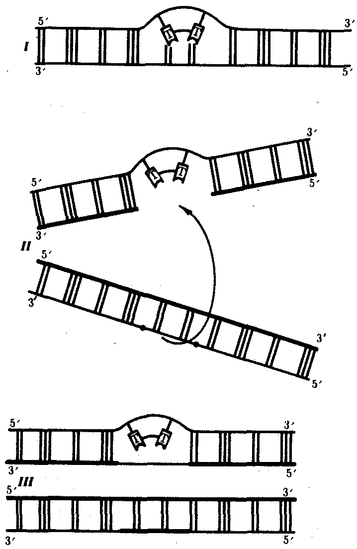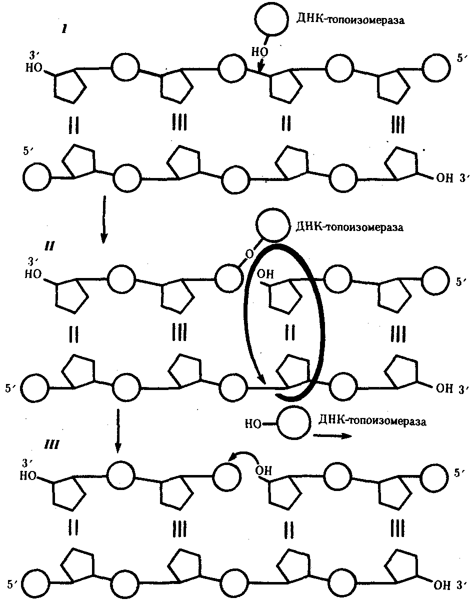 Рис.9. Разрыв одной из цепей ДНК с помощью фермента ДНК-топоизомеразы: I - ДНК-топоизомераза образует ковалентаую связь с одной из фосфатных групп ДНК (верхняя цепь); II - в результате разрыва фосфодиэфирной связи в одной полинуклеотидной цепи вокруг соответствующей ей связи другой цепи осуществляется вращение, которое снимает напряжение, вызванное расхождением двух цепей ДНК в области репликационной вилки; III - после снятия напряжения в спирали ДНК происходит спонтанное отделение ДНК-топоизомеразы и восстановление фосфодиэфирной связи в цепи ДНК