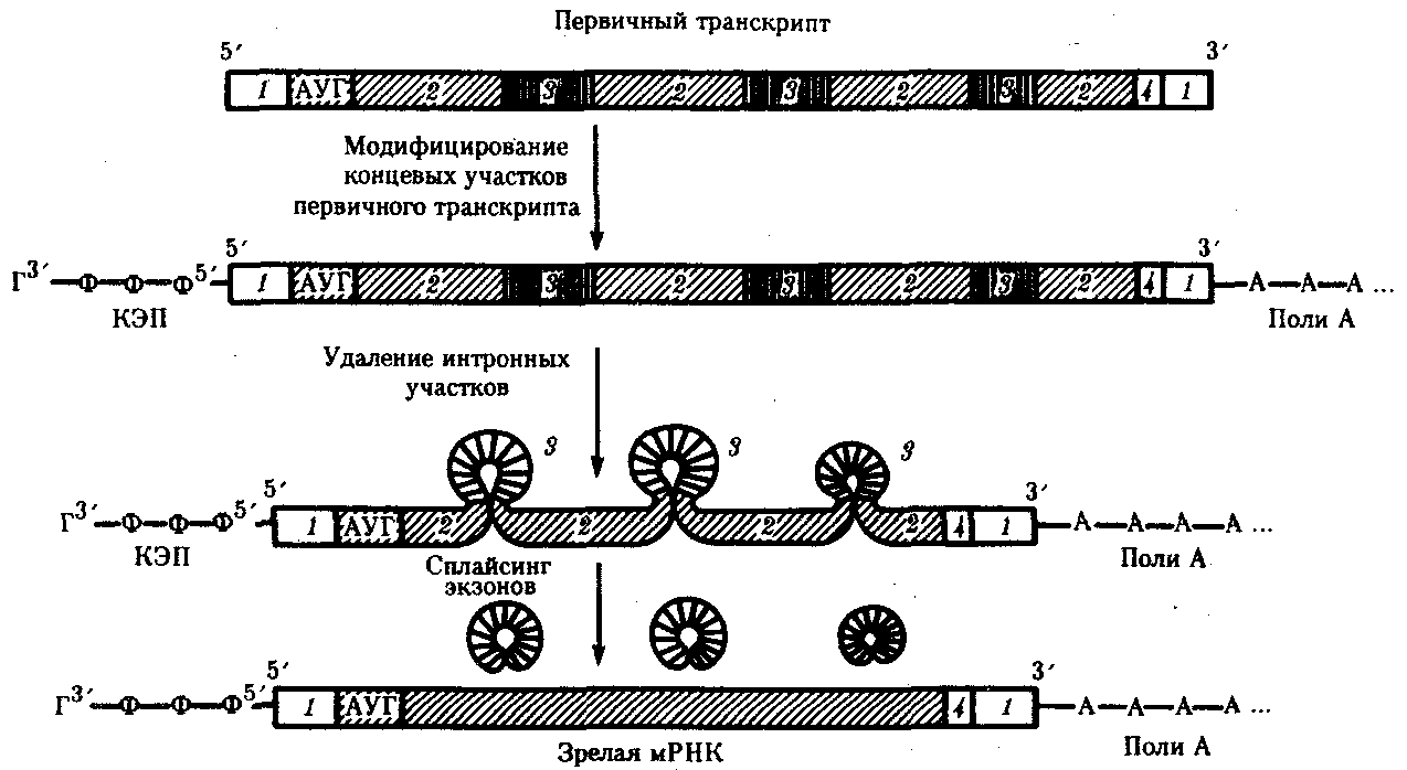 В отличие от прокариотических генов большинство генов эукариотических клеток прерывисты, так как несут в своем составе неинформативные нуклеотидные последовательности - интроны, не участвующие в кодировании информации. В связи с этим первичные транскрипты, синтезированные РНК-полимеразой II, обладают большими, чем необходимо для трансляции, размерами и оказываются менее стабильными. В совокупности они образуют так называемую гетерогенную ядерную РНК (тРНК), которая прежде чем выйти из ядра и начать активно функционировать в цитоплазме, подвергается процессингу и превращается в зрелые мРНК.