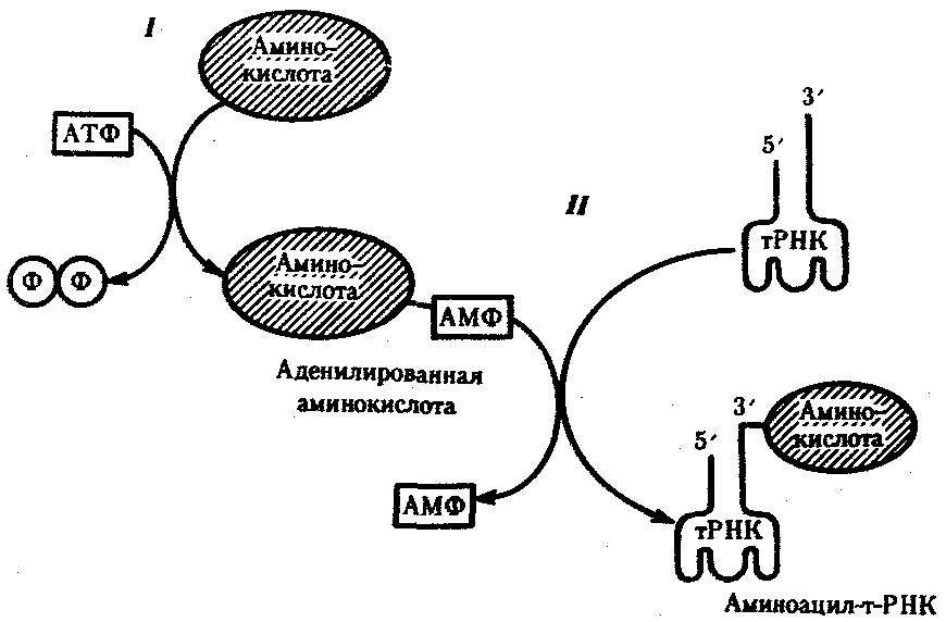 Наряду с функцией точного узнавания определенного кодона в мРНК молекула тРНК осуществляет доставку к месту синтеза пептидной цепи строго определенной аминокислоты, зашифрованной с помощью данного кодона. Специфическое соединение тРНК со "своей" аминокислотой протекает в два этапа и приводит к образованию соединения, называемого аминоацил-тРНК (рис.29).
