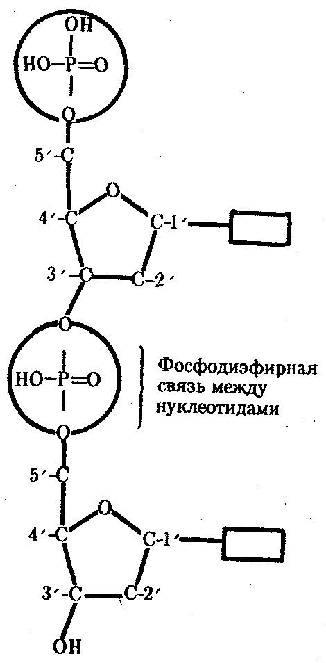 Сборка полинуклеотидной цепи осуществляется при участии фермента полимеразы, который обеспечивает присоединение фосфатной группы следующего нуклеотида к гидроксильной группе, стоящей в положении 3', предыдущего нуклеотида (рис. 3.3). Благодаря отмеченной специфике действия названного фермента наращивание полинуклеотидной цепи происходит только на одном конце: там, где находится свободный гидроксил в положении 3'. Начало цепи всегда несет фосфатную группу в положении 5'. Это позволяет выделить в ней 5' и 3 '-концы.