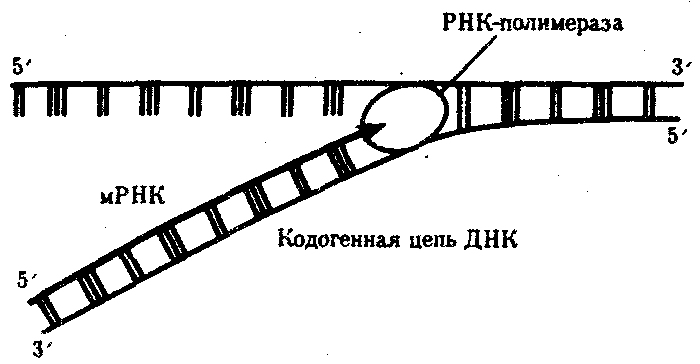 II - по мере продвижения РНК-полимеразы к 5'-концу мРНК прикрепляются рибосомы, начинающие синтез белка;