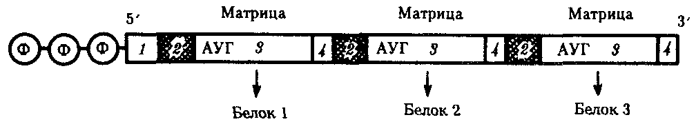 1 - некодирующие области, 2 - межцистронные области, 3 - кодирующие области, 4 - терминирующие кодоны