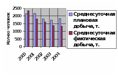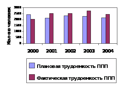 Проанализирована динамика численности персонала и трудоемкости процессов по добыче угля за 2000-2004 г.г. В результате анализа выявлено, что на трудоемкость работ влияют такие факторы как среднесуточная добыча и численность персонала, и что для снижения трудоемкости необходимо разработать мероприятия по росту добычи и численности.