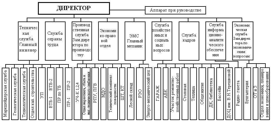 Далее производственная служба с подразделениями (участками) непосредственно участвующими в основном производственном процессе, которую возглавляет заместитель директора по производству; экономическая служба, занимающаяся вопросами экономической политики на шахте и возглавляемая заместителем директора по экономике; нергомеханическая служба во главе с главным механиком; служба охраны труда во главе с заместителем директора по охране труда и ТБ; маркшейдерская служба во главе с главным маркшейдером; геологическая служба, возглавляемая главным геологом; материально – техническое снабжение с начальником МТС; служба кадров, возглавляемая помощником директора по кадрам; служба быта во главе с заместителем директора по хозяйственным вопросам.