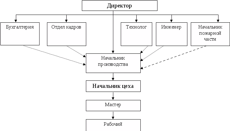 При таких полномочиях штабной персонал может давать указания линейным работникам в пределах своей компетенции. Наиболее яркий запоминающийся пример функциональных полномочий можно рассмотреть на примере пожарной части (рис.2.) На любом крупном заводе существует начальник пожарной части (штабной аппарат). При несоблюдении техники пожарной безопасности на производстве начальник пожарной части вправе приостановить работу цеха, участка.