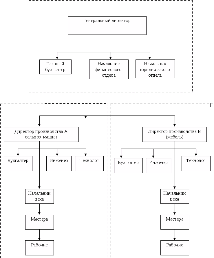 Для того чтобы уменьшить количество уровней управления в организационной структуре предприятия необходимо рассмотреть возможность его реорганизации путем выделения подразделений в самостоятельные юридические лица. Принцип такого выделения легко проиллюстрировать на примере дивизиональной структуры управления при диверсифицированном производстве на предприятии.