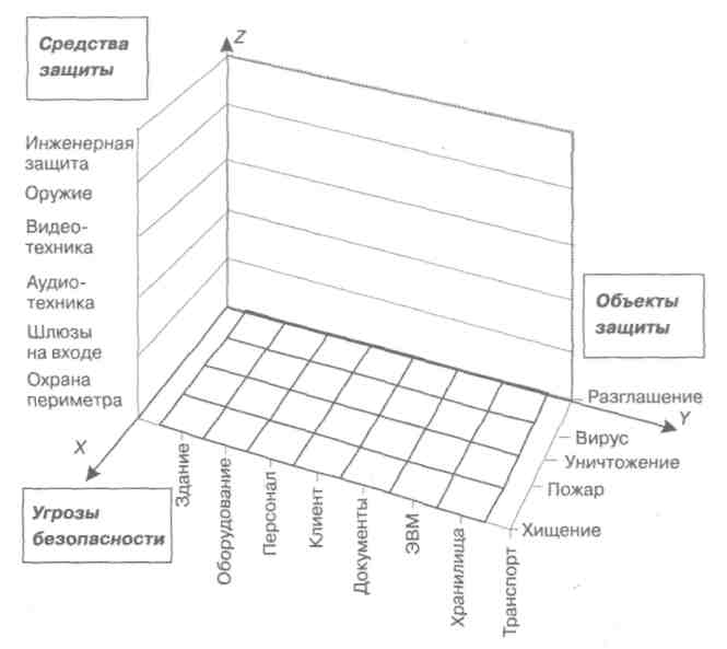Так, основные классификационные составляющие (признаки) угроз можно отобразить осями трехмерного пространства: X — виды угроз безопасности, Y — объекты защиты, Z — средства и методы защиты. Откладывая на каждой из осей максимальное на данный период число позиций, определенных по экспертным оценкам (или из теоретических, прогнозных, аналитических значений), получим ограниченную область (объем) потребностей безопасности («кубик безопасности»). Координате каждой точки этой области могут быть сопоставлены соответствующие формализованные особенности конкретного подлежащего защите объекта и выбраны те составляющие, которые и определят структуру потребностей безопасности этого объекта, а следовательно, и структуру службы безопасности, обслуживающей эти потребности.