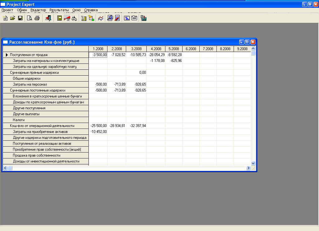 Предположим, тот объем продаж, который мы планировали на первые 5 месяцев не оправдался, и на самом деле был ниже, в 4 и 5 месяц были снижены затраты на материалы и комплектующие и затраты на персонал первые 3 месяца оказались вынужденно заниженными (рис.24). В этом случае результаты таковых изменений можно проследить с помощью рассогласованного кэш-фло (рис.25).