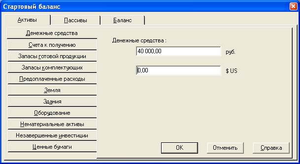 Открывая предприятие, Индивидуальный предприниматель располагает собственными средствами в размере 40 тыс. руб. Эти деньги явились стартовым капиталом для будущего предприятия. Стартовый баланс представлен на рисунке 4.