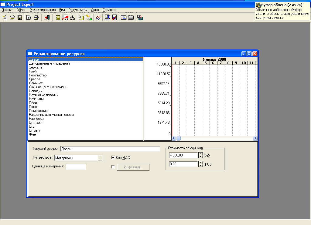Во вкладке «Ресурсы» представлены все ресурсы, необходимые материалы и оборудование, имеющими свою амортизацию: двери, кресла, стулья, расчески, ножницы, накидки, зеркала и так далее.