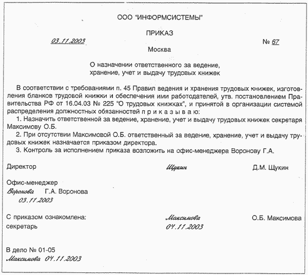 Организовать работу по ведению, хранению учету и выдаче трудовых книжек и вкладышей в них должен руководитель организации, назначив своим приказом (распоряжением) лицо, уполномоченное на ведение, хранение, учет и выдачу трудовых книжек, которое и несет ответственность за нарушение порядка ведения, учета, хранения и выдачи трудовых книжек.