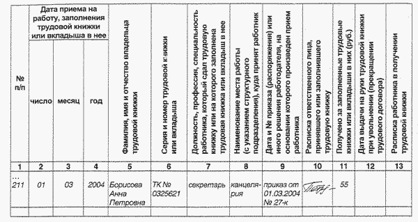 Если работник поступил на работу впервые и не имеет трудовой книжки и страхового свидетельства, то они должны быть заведены на него в течение первой недели работы. Эти книжки ведутся на всех работников, включая сезонных, временных и нештатных в соответствии с Инструкцией о порядке ведения трудовых книжек. Работодатель (за исключением работодателей — физических лиц, принимающих работников для домашних услуг) обязан вести трудовые книжки на каждого работника, проработавшего в организации более пяти дней, если эта работа является для него основной. Никаких вычеркиваний в них не допускается. Если надо ликвидировать запись (например, при восстановлении незаконно уволенных), то в следующем пункте указывается, что предыдущий пункт записи нужно считать недействительным. При потере трудовой книжки она может быть восстановлена по последнему месту работы.