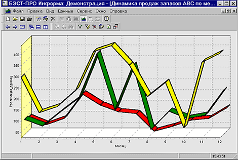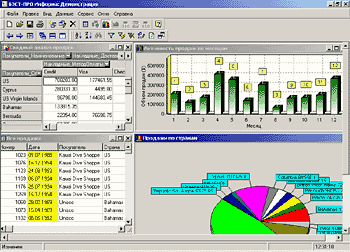 Поговорим о формах представления данных. Понятно, что самой простой формой представления любых данных с двумерной структурой является таблица. Для табличного представления настраиваются электронный вид и печатная форма таблицы. Еще один вариант - представление данных в виде двумерных диаграмм и графиков. При построении диаграмм пользователь имеет возможность выбрать желаемый тип диаграммы - "Линии", "Круговая", "Точечная", "Столбцы", цвета рамки и фона, надписи на осях, управлять объемом изображения, определить источники данных для оси абсцисс и оси ординат, выбрать цвет и стиль оформления диаграммы и пр.