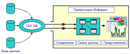 Для взаимодействия с БД используется OLE DB - интерфейс компании Microsoft, дающий возможность соединяться с различными видами баз. Следующим шагом после установления связи с БД является настройка схемы данных. Схема данных регламентирует порядок отбора и систематизации данных, а также устанавливает необходимые связи между ними. Далее, для настроенной схемы данных создаются представления, позволяющие визуализировать данные тем или иным способом. При этом поддерживается прямая связь с информационным источником, т.е. информация, фигурирующая в объектах презентации, оперативно обновляется по мере изменения содержимого исходных БД.