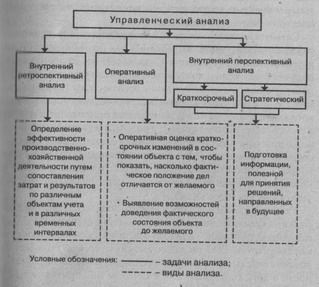 Аналитическая функция представлена в управленческом учете наряду с учетной, плановой и контрольной. Ее реализация возложена на управленческий анализ, являющийся одним из видов экономического анализа. Вопрос о содержании управленческого анализа, его месте в системе экономического анализа остается до настоящего времени мало исследованным. В специальной литературе экономический анализ классифицируется по ряду признаков. Одним из них является управленческий признак, согласно которому этапу предварительного управления (планированию) соответствует перспективный (прогнозный) анализ, этапу оперативного управления - оперативный анализ и заключительному (контрольному) этапу управления - текущий (ретроспективный) анализ. При этом подробно рассматриваются сущность, цели, а также задачи перспективного анализа и отмечается, что «развитая рыночная экономика порождает потребность в дифференциации анализа на внутренний управленческий и внешний финансовый».