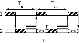 Такая ситуация возникает при циклическом обслуживании станков, на которых выполняются операции с неравной и некратной длительностью (рис. 1г).