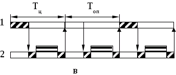 Такая ситуация возникает при циклическом обслуживании станков, имеющих не равную, но кратную длительность операций (рис. 1в).