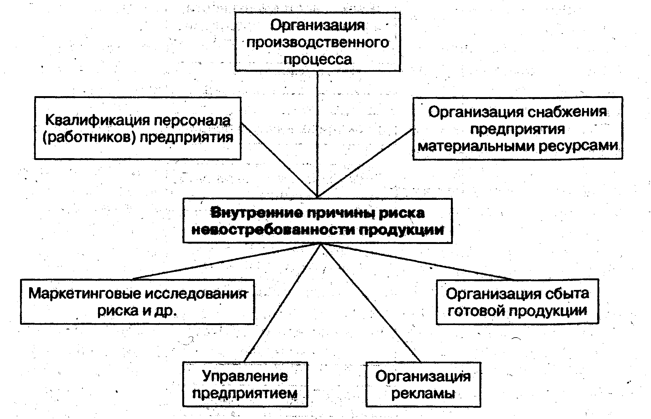 Риск невостребованности продукции возникает вследствие отказа потребителя от приобретения произведенной продукции. Риск характеризуется величиной возможного экономического и морального ущерба понесенного производителем по этой причине. Причин возникновения риска невостребованности произведенной продукции может быть много, но, как правило, они взаимосвязаны и взаимообусловлены. Эти причины по условиям возникновения можно разделить на внутреннне и внешние.