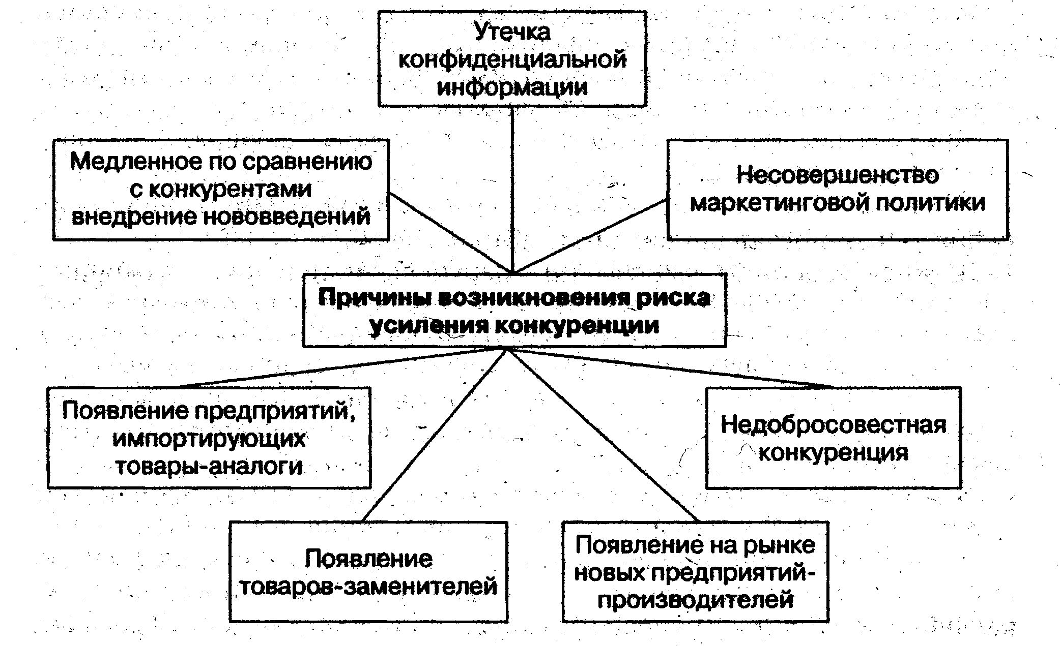 Утечка конфиденциальной информации может происходить либо по вине сотрудников предприятия, либо в результате промышленного шпионажа, предпринятого конкурентами. Несовершенство маркетинговой политики также, является причиной риска усиления уровня конкуренции; в большей степени к негативным последствиям для предприятия приводят ошибки, допущенные при выборе рынков сбыта, а также неполная или неверная информация о конкурентах предприятия.