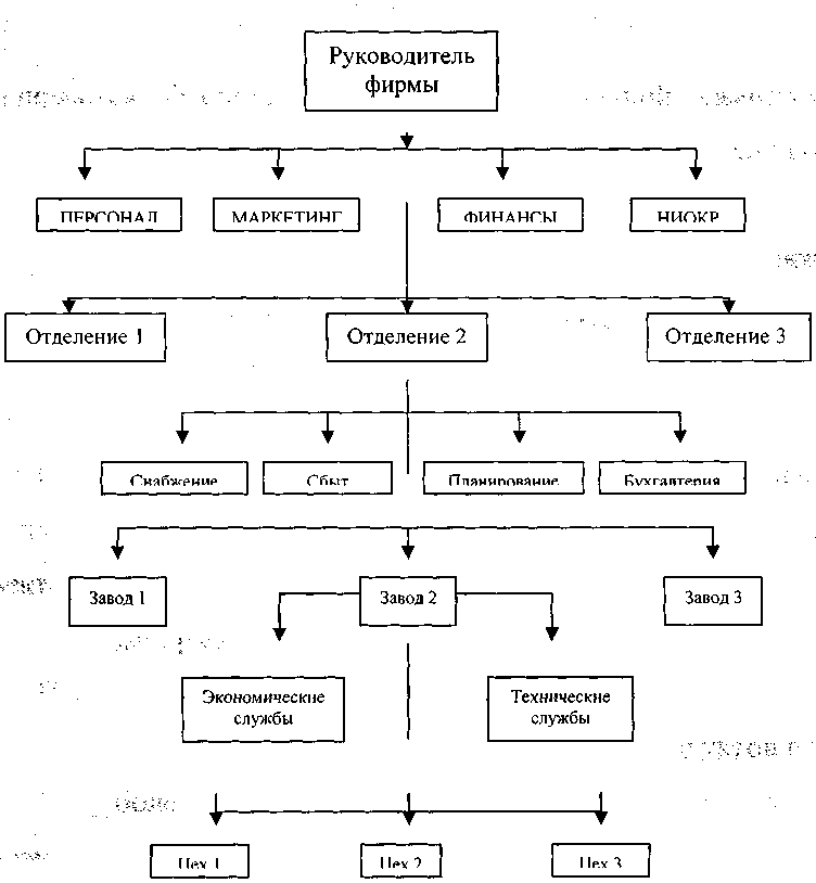 в зависимости от состава структурных подразделений организации вычленяются звенья структуры управления, осуществляющие маркетинг, менеджмент производства, научно-технического прогресса и т.п.;