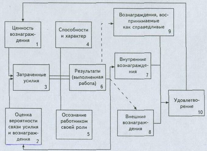 Достижение требуемых результатов (6) может повлечь внутренние вознаграждения (7), такие как чувство удовлетворения от выполненной работы, уверенность в своей компетентности и самоуважение, а также внешние вознаграждения (8) — похвалу руководителя, премию, продвижение по службе.
