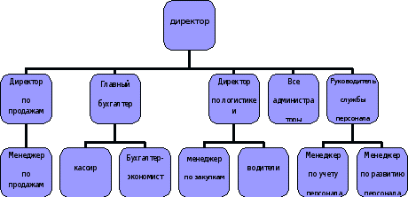 В непосредственном подчинении у директора фирмы находятся директор по продажам, директор по закупкам и логистике и все администраторы магазинов. В подчинении у директора по продажам находятся менеджеры по продажам. Директору по логистике и закупкам подчиняются водители и менеджеры по закупкам.