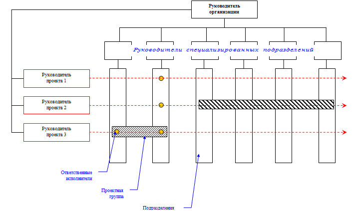 В матричной организации одинаковую роль играют два организационных принципа. В классификации Х. Минцберга выделяются три промежуточные организационные формы, которые характеризуются: