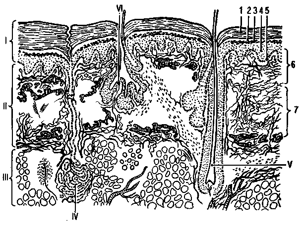 I —эпидермис, II —дерма, III — подкожная основа, IV — потовая железа, V- фолликул волоса, VI — сальная железа.