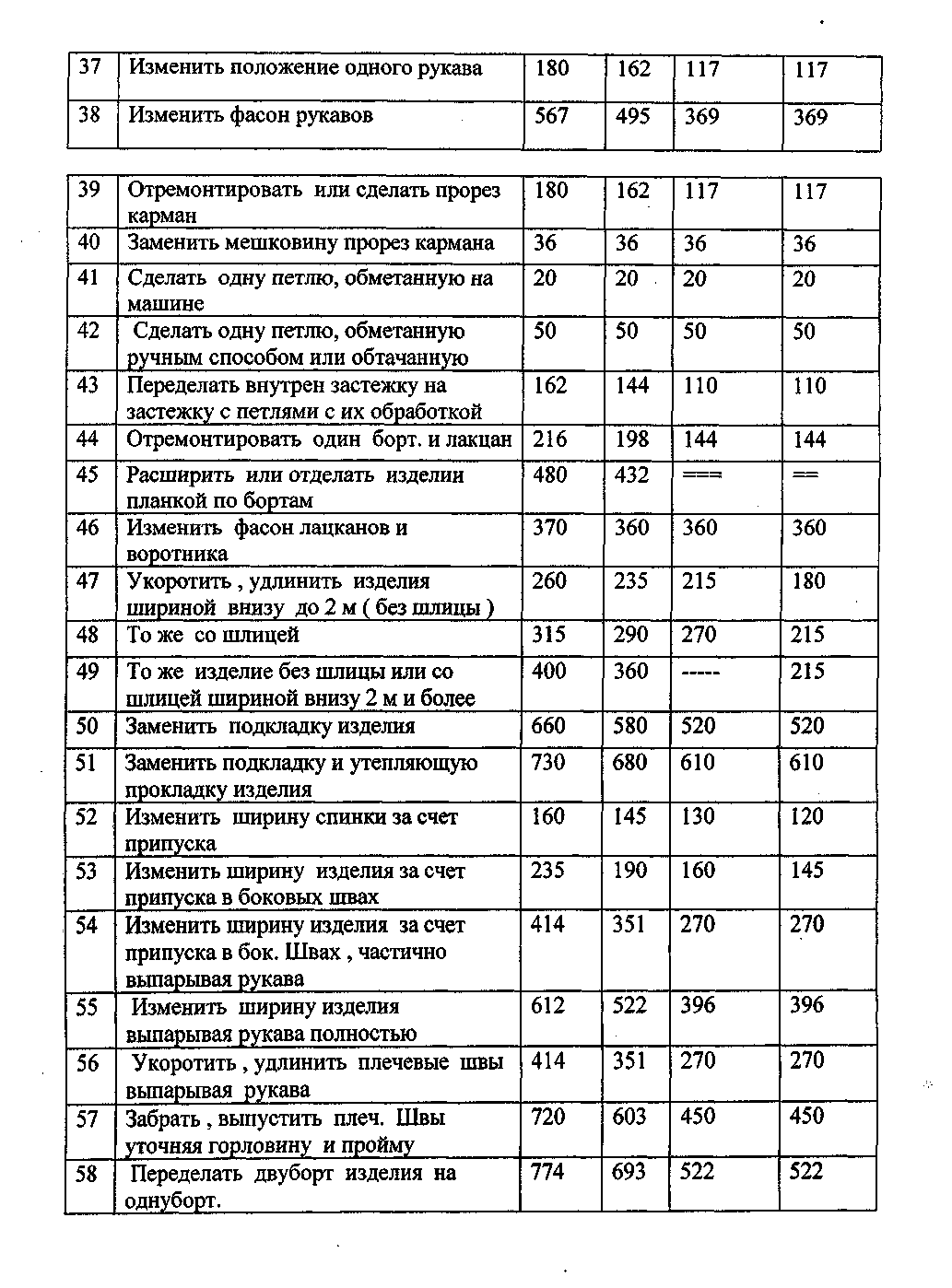 Таблица Г.1. Прейскурант на раскрой швейных изделий и подготовка к первой примерке