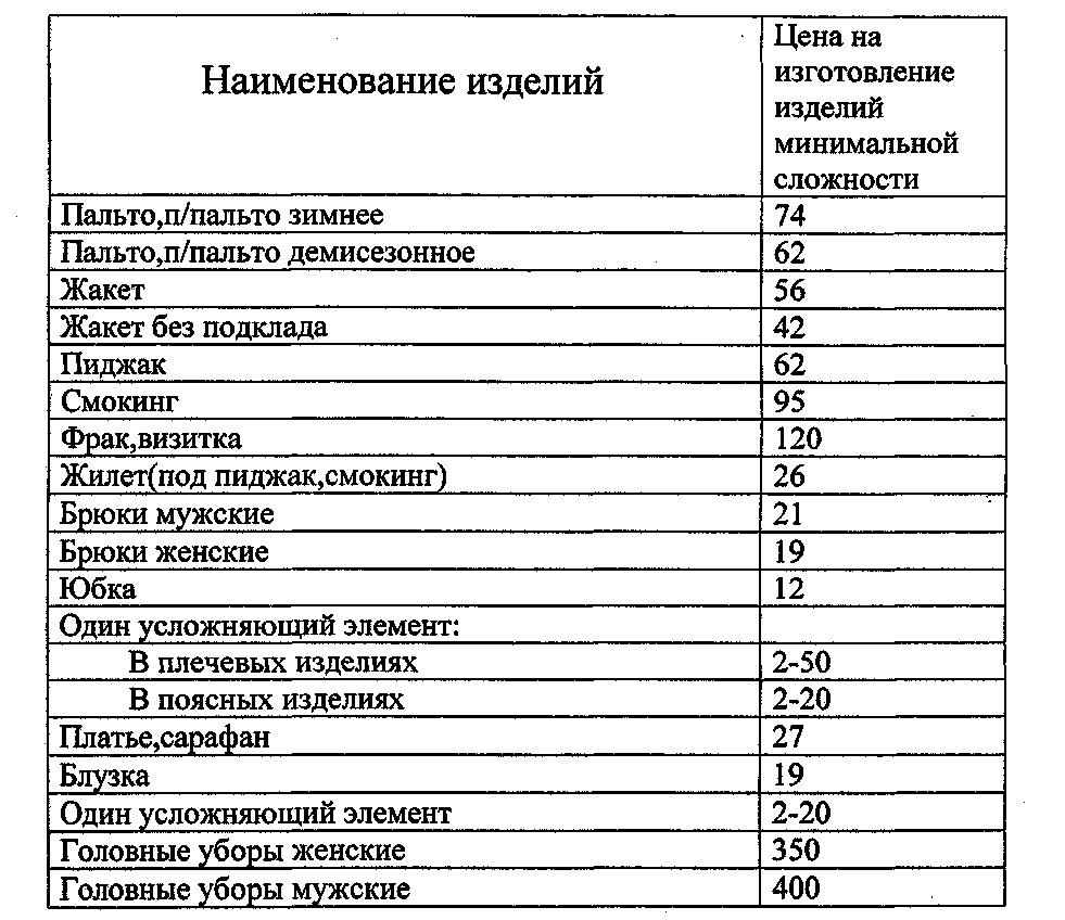 Таблица Д.1. Прейскурант на изготовление швейных изделий по заказам населения