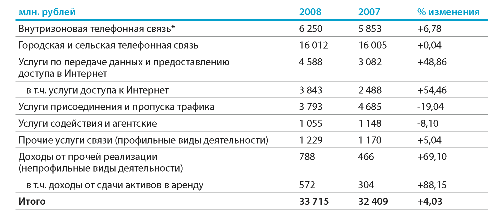 В 2008 году темпы роста рынка фиксированной связи составили 16% против в рублевом выражении, и его объем достиг почти $22 млрд. Основными драйверами роста выступили сегменты межоператорских услуг (рост по сравнению с 2007 годом на 21%) и сегмент документальной электросвязи (рост на 34%), в основном сформированный услугами широкополосного доступа и передачи данных.
