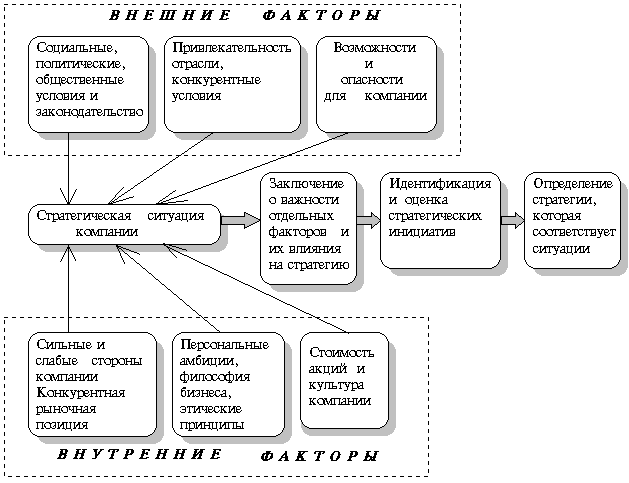 Как правило, стратегия не обеспечивает успеха, если не проведена граница между внутренней и внешней ситуацией, не обеспечено приобретение существенных конкурентных преимуществ и не улучшена деятельность компании.