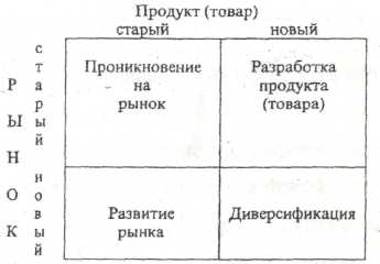 Матрица "продукт/рынок" была предложена в конце пятидесятых - начале шестидесятых годов под названием "вектор роста" (growth vector). Эта матрица предусматривает использование четырех базовых стратегий: проникновение на рынок, развитие рынка, разработка товара и диверсификация.