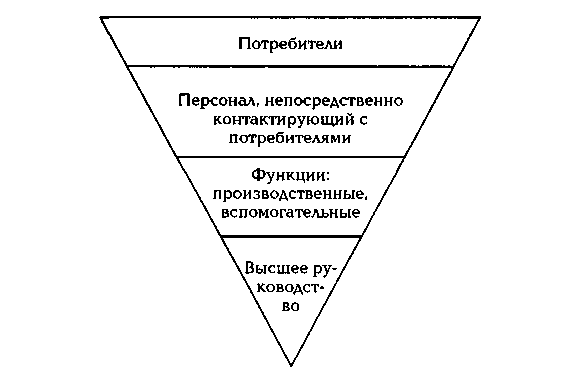 Перевернутая основанием вверх пирамида подчеркивает подход образцовых компаний; нужды потребителей определяют всю деятельность предприятия, а персонал, непосредственно контактирующий с потребителями, — важнейшая категория работников (см. рис. 1.).