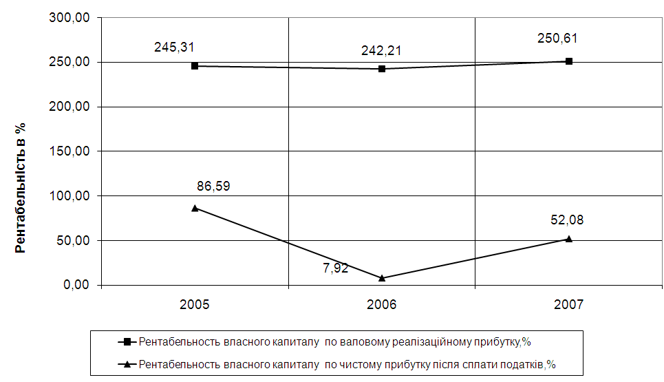 високий рівень рентабельності власного капіталу по валовому реалізаційному прибутку (242-251%) та його зниження в 3-6 разів при розрахунках рентабельності власного капіталу по чистому прибутку після оподаткування;