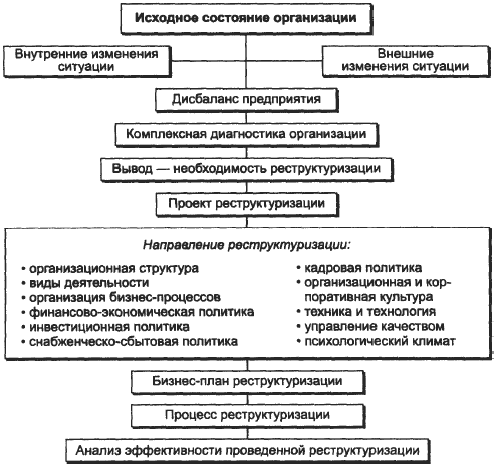 Реструктуризация подразумевает системный характер оптимизации функционирования компании. Она включает многоаспектный и взаимоувязанный комплекс мероприятий, процессов, методов, начиная с комплексной диагностики компании и до реорганизации как организационной структуры, так и бизнес-процессов на базе современных подходов к управлению, в том числе методологии управления качеством, реинжиниринга бизнес-процессов, информационных технологий и систем.