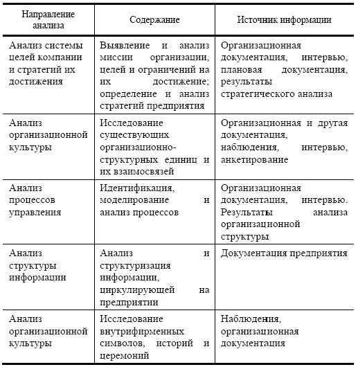 Организационно-управленческий анализ. Цель этого анализа – исследование текущего состояния системы управления предприятием. Под системой управления понимается совокупность активных социальных и пассивных технических субъектов и объектов, реализующих процессы управления в рамках существующей организационной структуры и культуры.