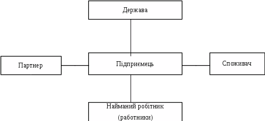 Основним суб'єктом підприємницької активності виступає підприємець. Однак підприємець - не єдиний суб'єкт, у будь-якому випадку він змушений взаємодіяти зі споживачем як основним його контрагентом, а також з державою, що у різних ситуаціях може виступати як помічника або супротивника. І споживач і держава також відносяться до категорії суб'єктів підприємницької активності, як і найманий робітник (якщо, звичайно, підприємець працює не поодинці), і партнери по бізнесі (якщо виробництво не носить ізольованого від суспільних зв'язків характеру) (рис.1).