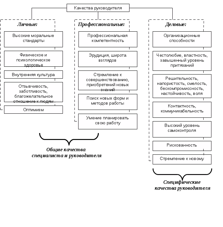 К профессиональным качествам относят те, которые характеризуют любого грамотного специалиста и обладание которыми служит лишь необходимой предпосылкой выполнения им обязанностей руководителя. Личные качества руководителя также мало чем должны отличаться от качеств других работников, желающих, чтобы их уважали и с ними считались, поэтому обладание ими тоже всего лишь предпосылка успешного руководства. Однако руководителем делают человека не профессиональные или личные, а деловые качества.