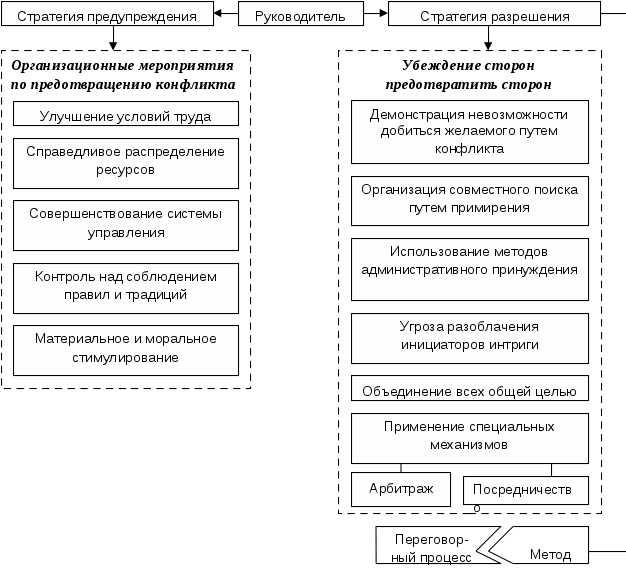 Стратегия предупреждения конфликта сводится в основном к мероприятиям организационного и разъяснительного характера: улучшению условий труда, более справедливому распределению ресурсов и вознаграждения, изменению структуры организации, методов управления ею, контролю за соблюдением правил внутренней жизни, традиций, норм поведения, служебной этики.