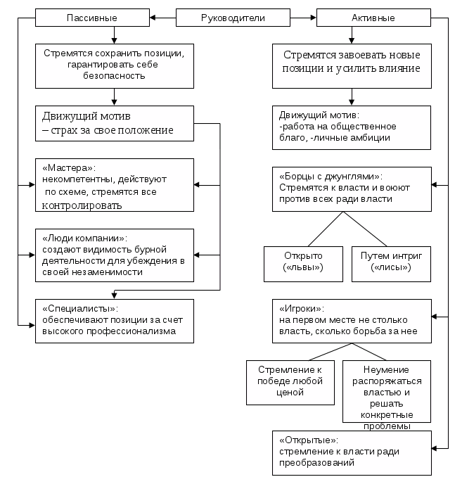 Первый тип получил условное название “борцы с джунглями”. Эти люди стремятся к безраздельной власти и воюют против всех, считая их, если не реальными, то потенциальным врагами, и используют в этой войне своих подчиненных, “выкладывая” ими путь к своему торжеству. В зависимости от используемых при этом методов они делятся на две разновидности; “львов”, действующих в открытую, и “лис” в основном занимающихся интригами. Второй тип ориентированных на себя активных руководителей “ игроки”. Для них основной интерес представляет не столько сама должность как таковая, сколько процесс ее получения. Поэтому они активно участвуют в различных кампаниях, довольствуются сиюминутными победами, добиваясь их любой ценой, плохо справляются с реальными делами и на практике больше разрушают, чем создают, с реальными делами справляются плохо.