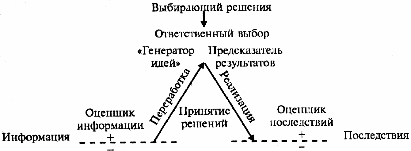 Организуя принятие решения в таких зонах «коммуникативного пространства», руководитель тем самым минимизирует риски возможных негативных последствий. С этого момента руководитель берет на себя всю ответственность за тот сценарий, который будет разворачиваться в управленческом цикле. В самом акте выбора управленческого решения его роль как «генератора идей» соотносится с ролью предсказателя тех результатов, которые «запускаются» в сценарный исход управленческого решения (рис. 1).