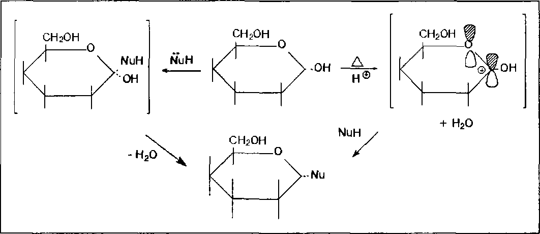 Из схемы 6.1 очевидно, что два атома кислорода при одном углероде как пиранозной, так и фуранозной форм моносахарида - это уже достаточное основание для создания существенного положительного заряда на этом атоме. Вследствие этого, для молекулы открываются две возможности реагирования: во-первых, облегчается диссоциация по связи С-ОН с образованием соответствующего карбкатиона, катионный центр которого стабилизирован взаимодействием с п-уровнем эндоциклического атома кислорода; во-вторых, достаточно большой положительный заряд на углероде создает благоприятную предпосылку для непосредственной атаки его нуклеофильным реагентом. Другими словами, ожидается, что полуацетальный гидроксил пираноз и фураноз будет легко замещаться нуклеофильно как по механизму S>N>1; так и по механизму S>N>2.