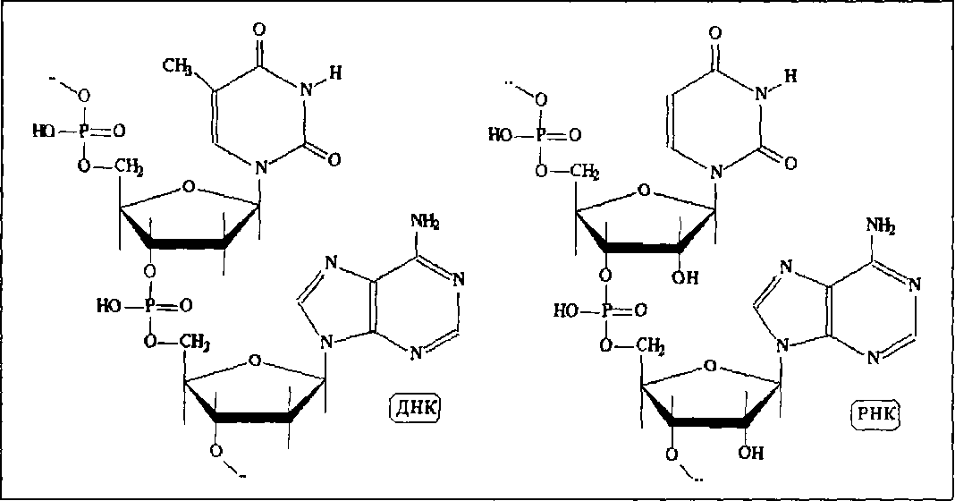 Различаются они между собой природой моносахарида и набором оснований, образующих Н-гликозидный фрагмент: в ДНК это тимин, цитозин, аденин, гуанин, в РНК - урацил, цитозин, аденин, гуанин.
