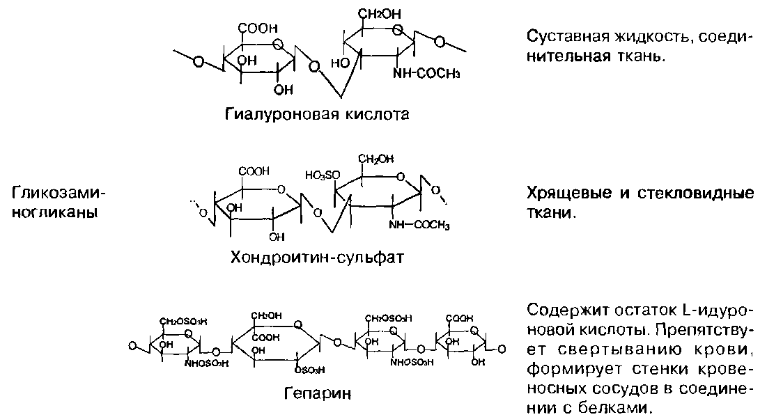 Аминосахара редко встречаются в свободном виде, обычно они входят как мономерные звенья в цепочки различных полисахаридов. Но так как в связанном виде они распространены широко и, можно сказать, фундаментально, мы эти звенья как бы в изолированном виде и рассмотрим. Важнейшими из них являются 2-аминопроизводные глюкозы и галактозы, аминогруппа которых может быть свободной или модифицированной ацильной или сульфогруппами.