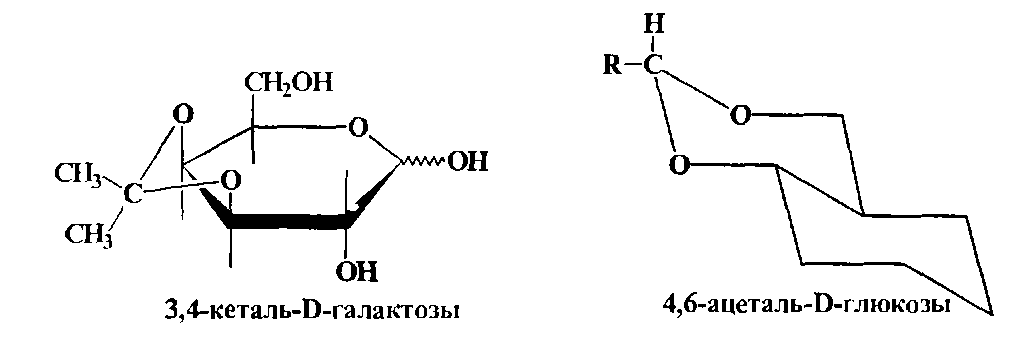 Специфические свойства моносахаридов. Наличие в молекуле углеводов спиртовых гидроксилов открывает возможность одновременного участия в реакции нескольких из них. Типичная реакция моносахаридов с карбонильными реагентами приводит к образованию циклических ацеталей, структура которых определяется взаимным пространственным расположением гидроксильных групп: обычно в таких реакциях участвует пара цис расположенных гидроксифункций.